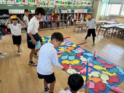 「子どもフェスティバル」では、各学級で赤チームと青チームに分かれ、一方がお店番、もう一方が縦割り班でお店まわりをします。
