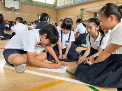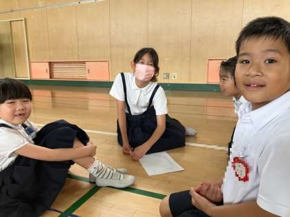 どの先生のことか、たてわり班で考えて、解答用紙に書いています。