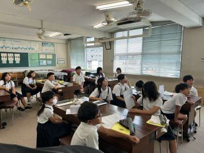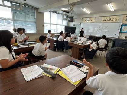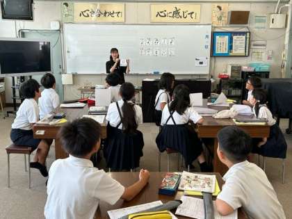 子どもたちが、白板に連続して貼られた4分音符や8分音符を見て、タン・タン・タタ・タタ…… と手をたたいてリズムをとっていました。