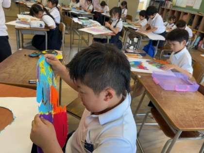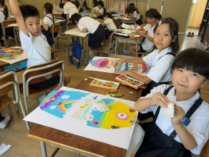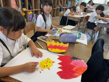 以前につくった「ふしぎなたまご」が割れて、中から生まれてくるものを、今日は描きました。