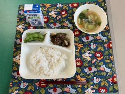 チンジャオニューロウスー、中華みそスープ、えだまめ、ごはん、牛乳