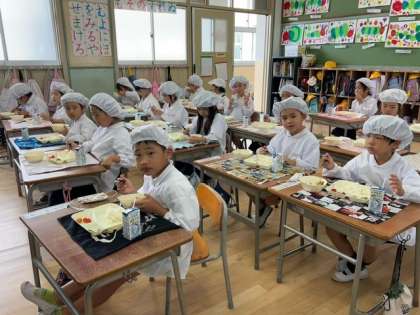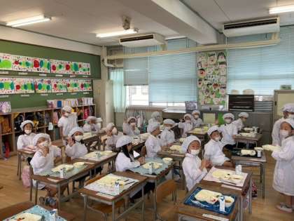 1年生の子どもたちが、お行儀よく給食を食べています。