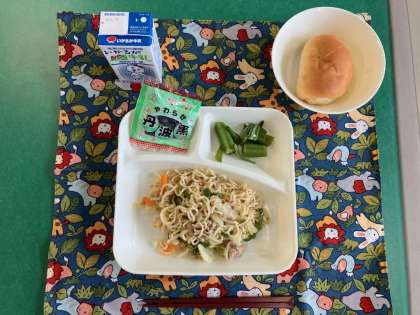 和風焼きそば、オクラの甘酢あえ、ソフト黒豆、ミニコッペパン、牛乳