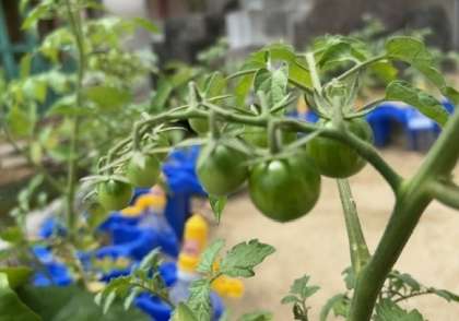 (写真は、数日前の夕暮れと2年生の子どもたちが育てているミニトマトです)