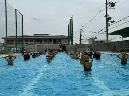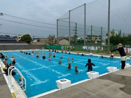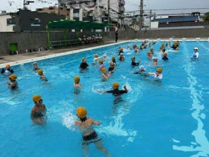 子どもたちが、先生の指示をよく聞き、いろいろな浮き方をしたり、水中で体を動かしたりしています。
