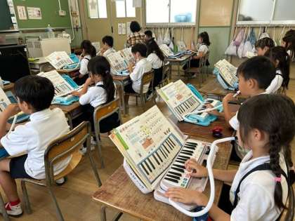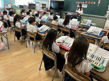 子どもたちが、先生の伴奏に合わせて、鍵盤ハーモニカを吹きました。