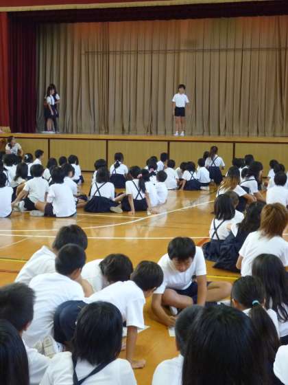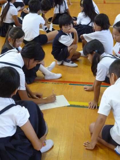 集会委員会の担当の児童が、みんなの前でジェスチャーを・・・。何を表現しているのか縦割り班で相談して解答用紙に記入します。