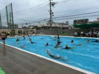 プールの横を使って、クロールのバタ足や腕のふりを練習したあと、昨日に続いて25m(縦のコース)を泳ぎました。