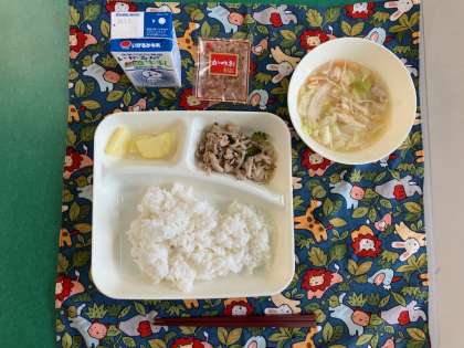 豚肉ともやし、にがうりを塩、しょうゆでいためています。喫食時にかつおぶしをかけていただきます。