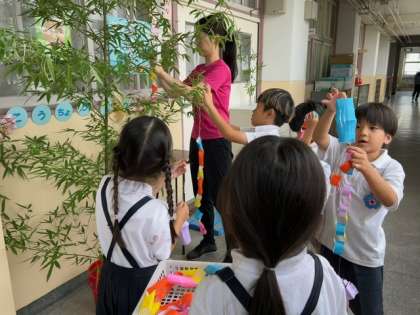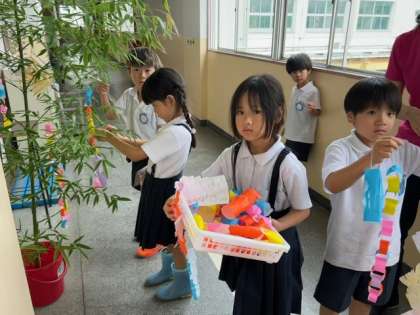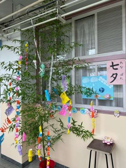 短冊を準備する前に、1年生の子どもたちが、先生と一緒に「飾り」をつくって持ってきてくれました。かわいい「七夕飾り」ですね。