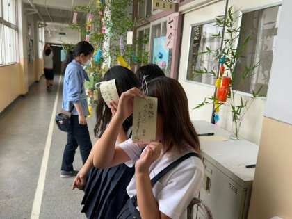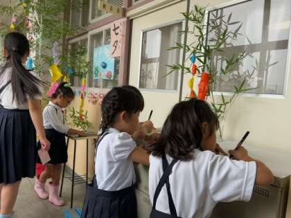 昼休みに、子どもたちが「願いごと」を書きに来ています。