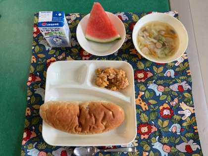 チキンパエリア、ウインナーとキャベツのスープ、すいか、パン、牛乳