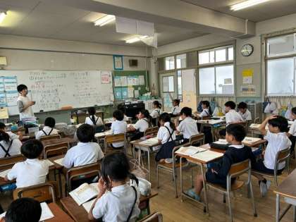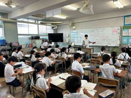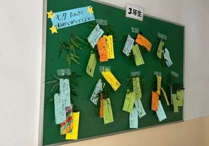 3年生の学年掲示板には、子どもたちが学級活動で書いた「七夕の願いごと」が貼ってあります。