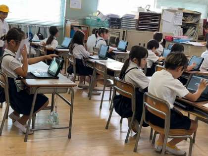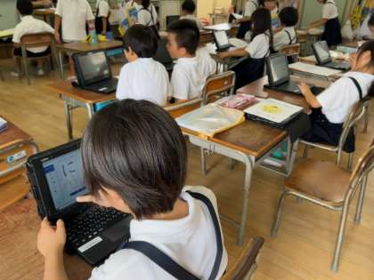登校してきた子どもたちが、タブレット端末で、今日の「心の天気」を入力しています。