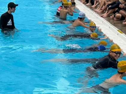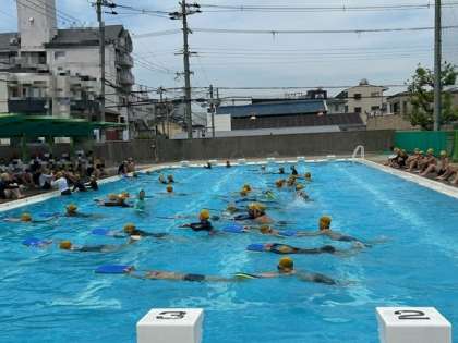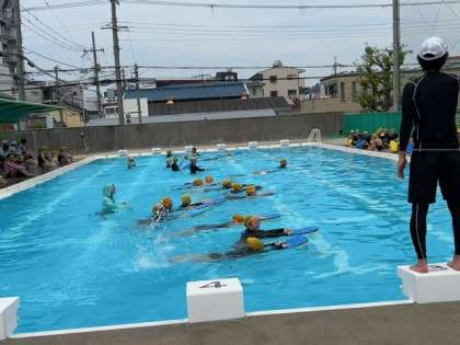 初めは壁に手をかけ、次にビート板を使って泳ぎました。