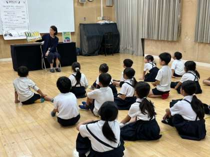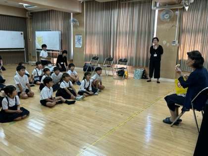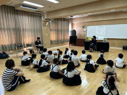 2年生の子どもたちが、絵本「バナナの話」を熱心に聞いています。