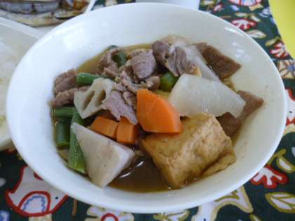 牛肉、あつあげ、だいこん、れんこんなどを甘辛く煮こんでいます。