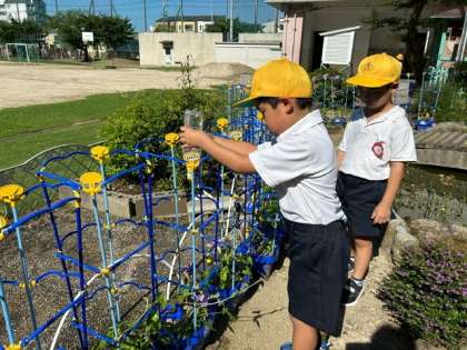登校してきた1年生の子どもたちが、プランターの「アサガオ」に水をあげています。