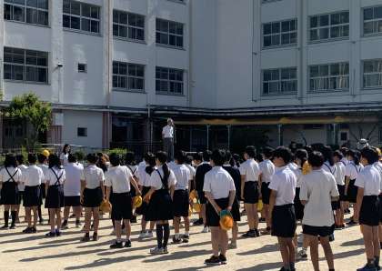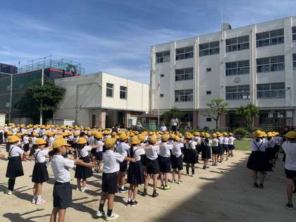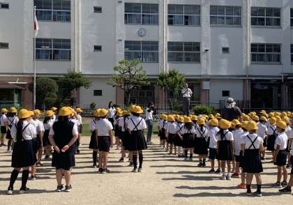 子どもたちが、帽子をとって、元気よく朝のあいさつをし、校長先生の話を聞きました。