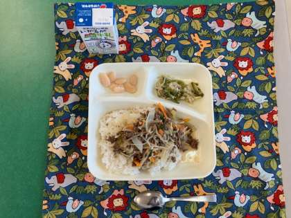 牛肉、たまねぎ、にんじん、糸こんにゃく、えのきたけ、青みに青ねぎを入れた具沢山の牛丼です。児童に人気の献立です。