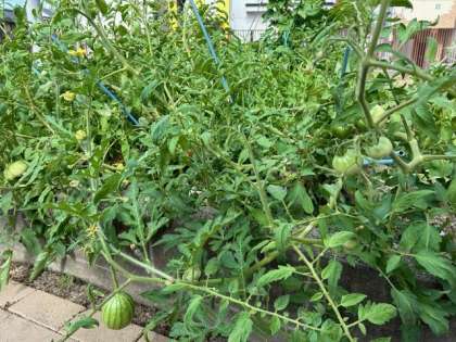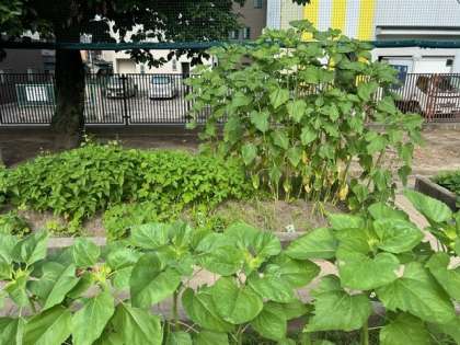 学習園の花壇に、ヒマワリ・オクラが植えられています。