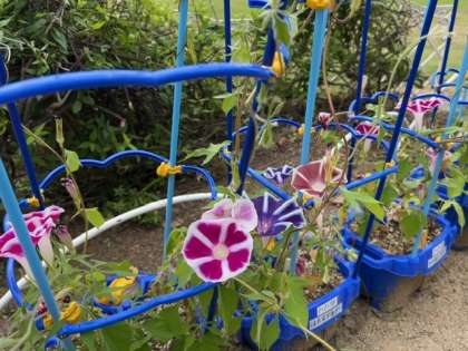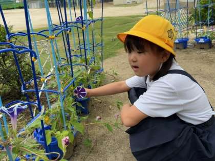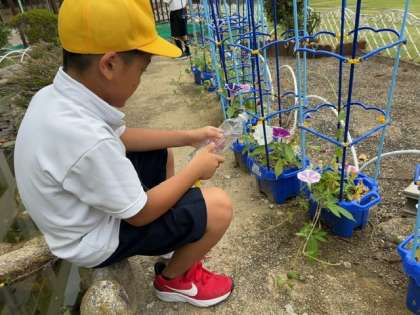 登校してきた子どもたちが、「アサガオ」の水やりをしています。