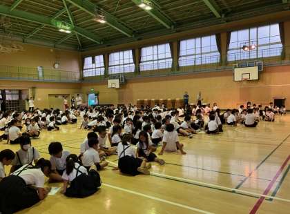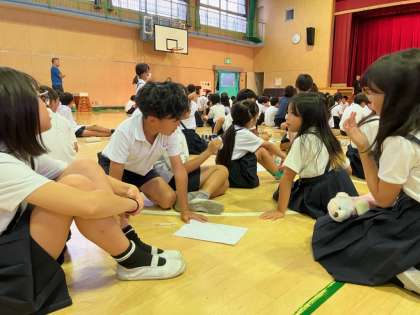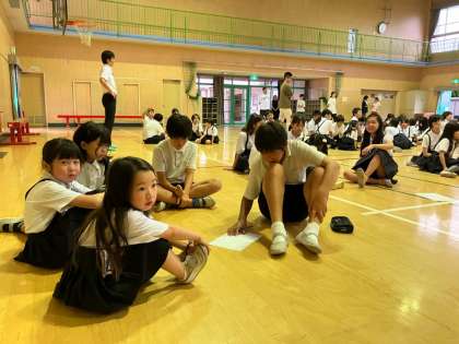 集会委員会の児童が舞台上で、「あるもの」を投げます。それが何かを当てます。