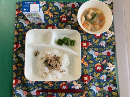鶏肉と野菜の煮もの、オクラの梅風味、ツナっ葉いため、ごはん、牛乳