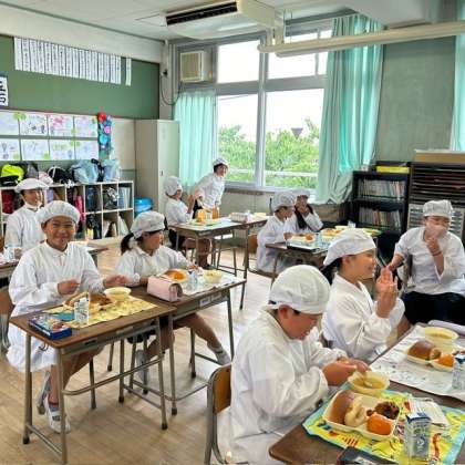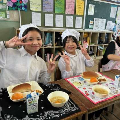 (今も昔も変わらず、子どもたちの笑顔は学校や教員にとって最高の喜びです。写真は4年生の給食風景です。)