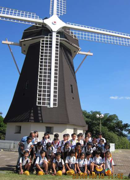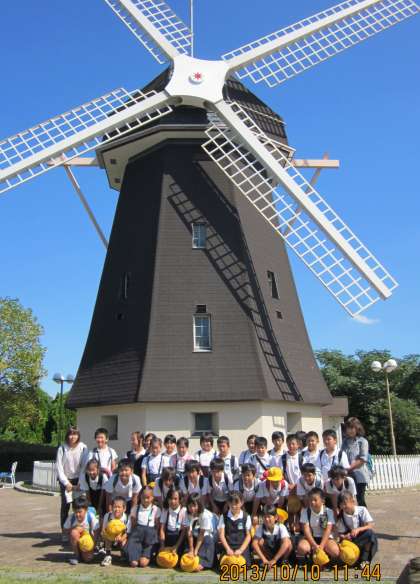 鶴見緑地「風車」の前で記念写真。