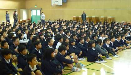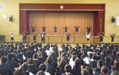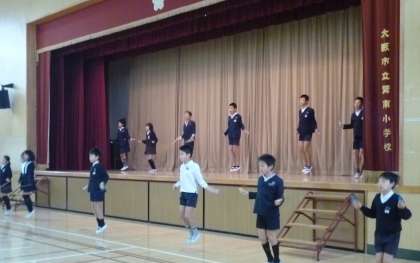 今日は、運動場が使えなくて、講堂で「全校集会」をしました。明日から始まるなわとび集会のやり方を、体育委員会の人たちが「マツケンサンバ」の音楽にのって、わかりやすく実演してくれました。