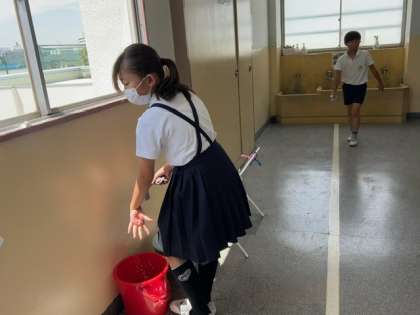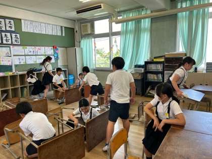 1組の子どもたちが、机やいすなどをきれいに拭き、教室の中もきれいにしていました。