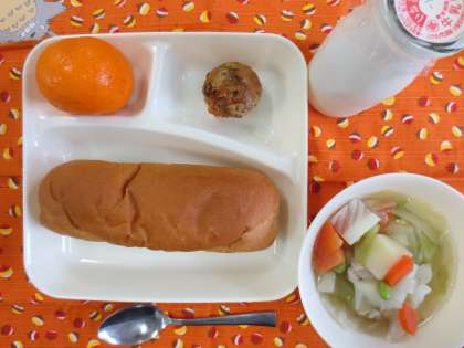 たこボール、洋風煮、みかん、黒糖パン、牛乳