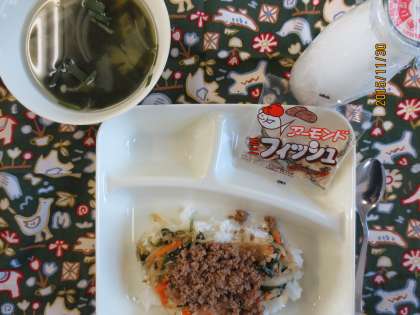 ビビンバ、わかめスープ、アーモンドフィッシュ、牛乳