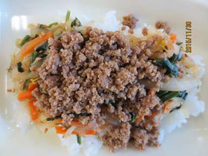 韓国・朝鮮料理のビビンバです。ご飯に色々な具をのせて混ぜて食べます。