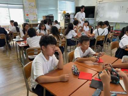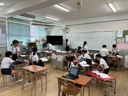 子どもたちが、タブレット端末を使っての宿題の答え合わせや、折り紙で「鶴」をつくったりしていました。