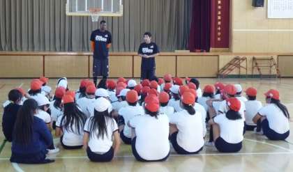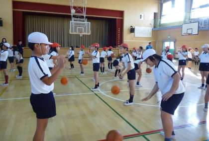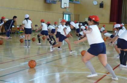 5時間目に、5年生を対象にしたエヴェッサの「バスケットボール教室」がありました。まず、あいさつをして、ボールを使った簡単なゲームをしました。