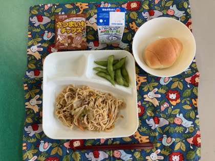 焼きそば、えだまめ、おさつチップス、ミニコッペパン、牛乳