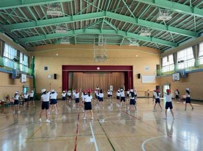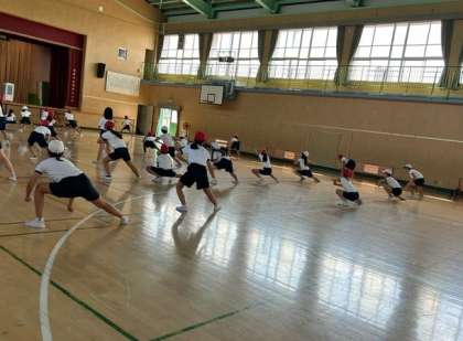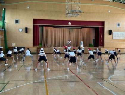 体育館で1・2組合同で「ソーラン」の練習が始まっていました。