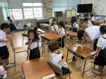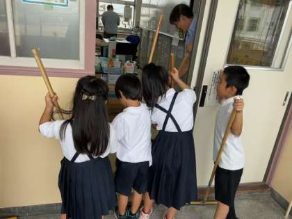 1年生の子どもたちが、教室・廊下・職員室前をていねいに掃いたり拭いたりしています。