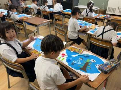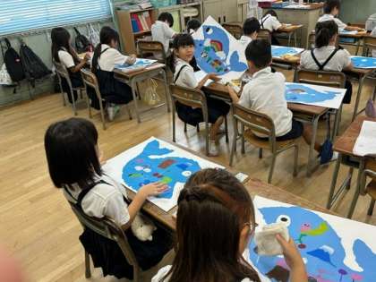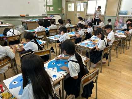 前の時間(8/28掲載)に、クジラをつくって画用紙に貼りました。