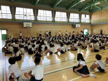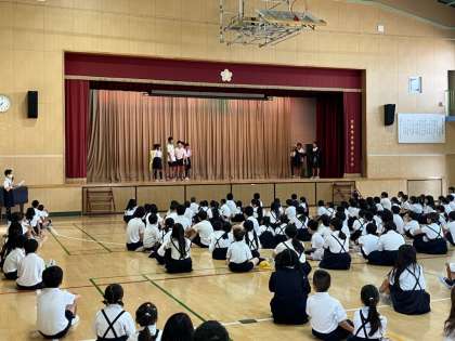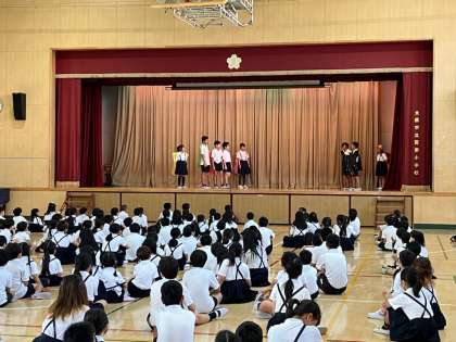 今週は「あいさつ週間」、今日の児童集会では、児童会代表委員・運営委員が「あいさつ」の劇を披露してくれました。