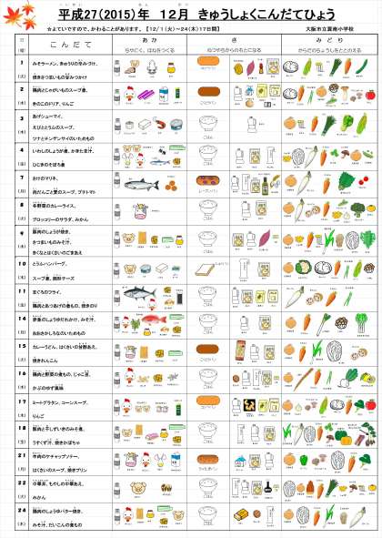 12月給食献立表・はぐくみ通信12月号を先日配付しました。ホームページの右記の配布文書「給食関係」にも載せています。