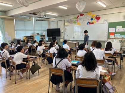 (4年生の子どもたちが、良い姿勢で話を聞いています。)
