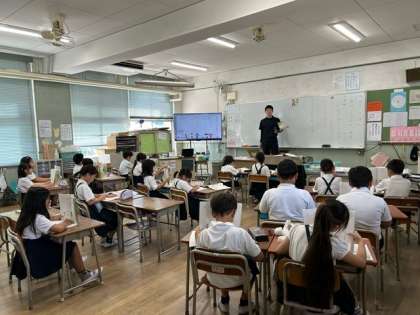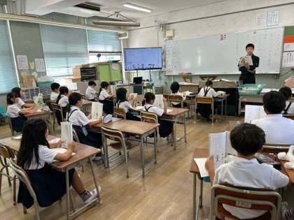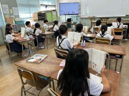 子どもたちが「空に ぐうんと 手を のばせ」の詩を、想像を広げながら何度も音読していました。