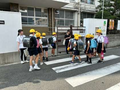 暑い日が続きますが、子どもたちが、元気に登校してきました。実習生が、門で子どもたちを迎えています。
