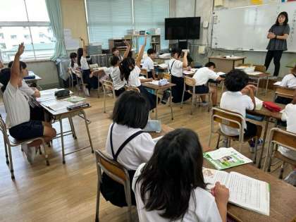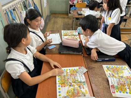 1組の外国語活動では、アルファベットの大文字小文字を使ったクイズをしていました。