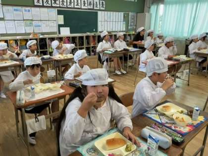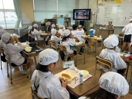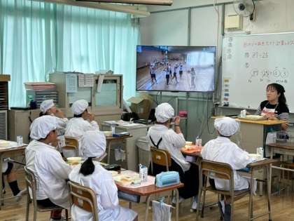 給食中の教室をのぞくと、子どもたちと先生が、運動会の団体演技として練習している「エイサー」(練習の録画)を見ていました。
