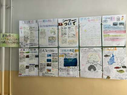 エイサーは沖縄の舞踊です。そこで、子どもたちが、「沖縄」のことについて、たくさんの調べ学習をしました。