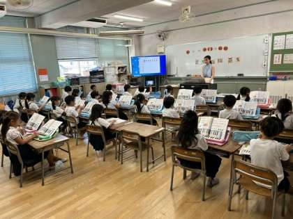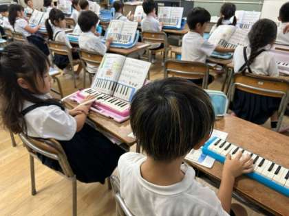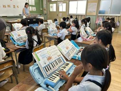 子どもたちが、「鍵盤(けんばん)ハーモニカ」の練習をしました。